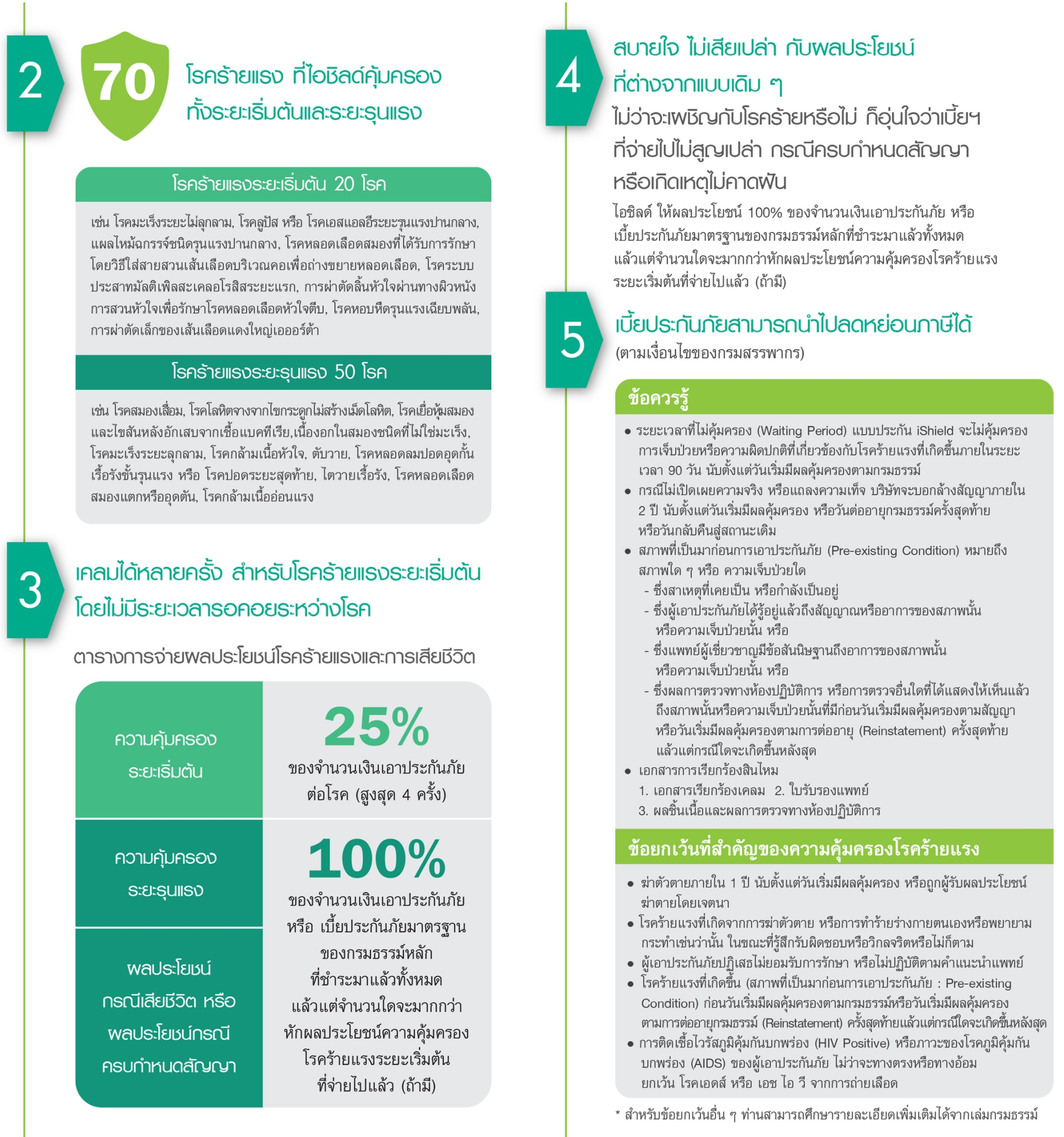คุ้มครอง 70 โรคร้ายแรง แบ่งเป็น โรคร้ายแรงระยะเริ่มต้น 20 โรค และโรคร้ายแรงระยะรุนแรง 50 โรค